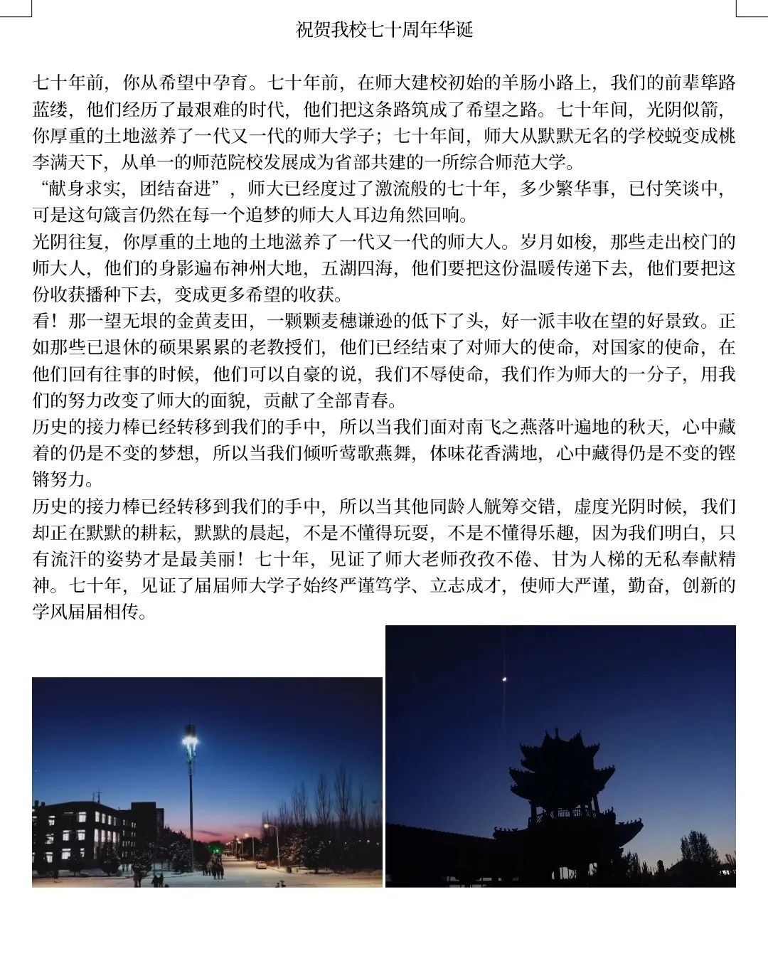 19级各团支部开展了“喜迎校庆”为主题的征文活动。大家集思广益,积极投稿,有诗歌,有散文,献上对母校的祝福,共同庆祝师大的七十周年华诞。