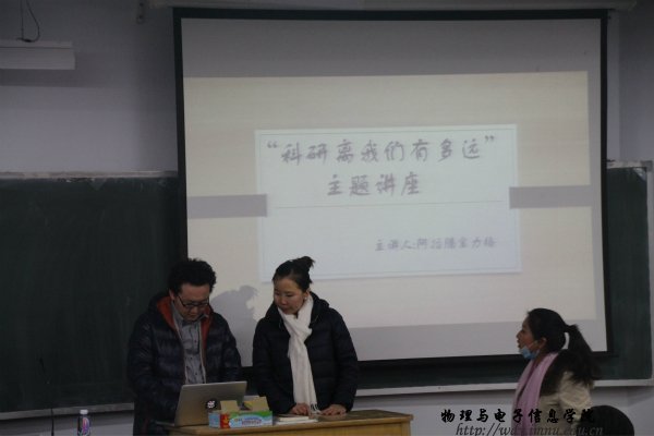 本网讯2015年11月24日晚,根据我院开展科技文化月的需要,推动学院良好学风学术建设,开阔我院师生视野,引导学子了解科技的力量。由我院博士后研究员阿拉腾宝力格老师,开展“科研离我们有多远”主题讲座,学工办萨其尔老师出席此次活动。