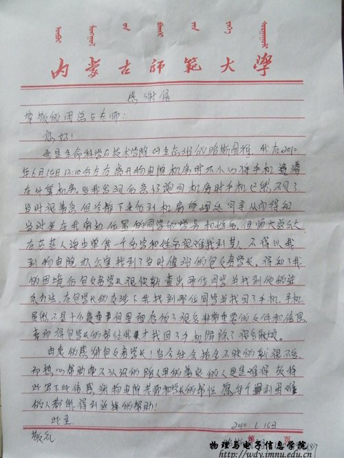 6月15日下午,我院06预科班学生包文君同学在学院机房捡到一手机,及时找到失主并将手机归还给生科院学生。该生这种拾金不昧的精神值得我们学习,学院决定给予包文君同学全院通报表扬。