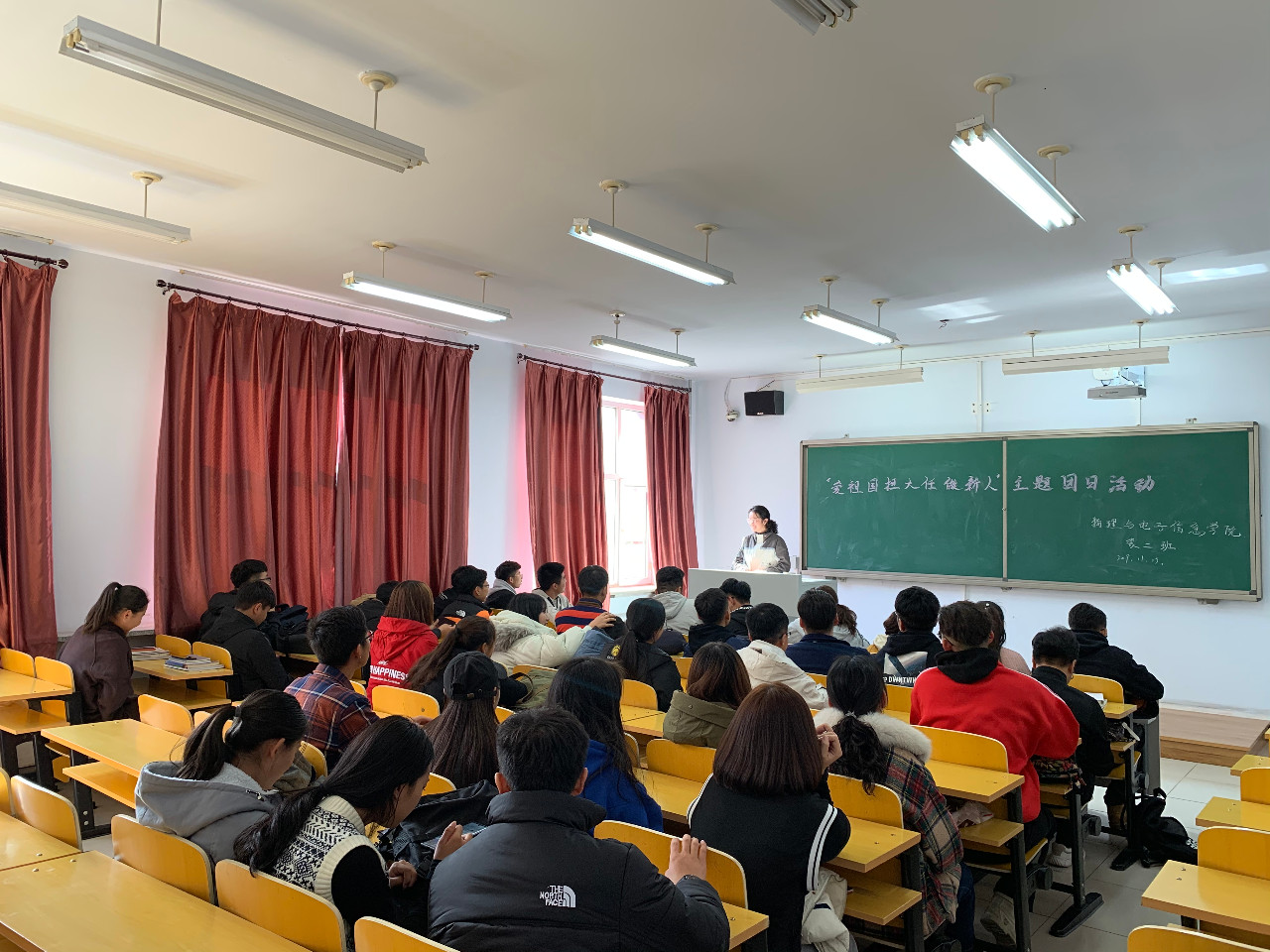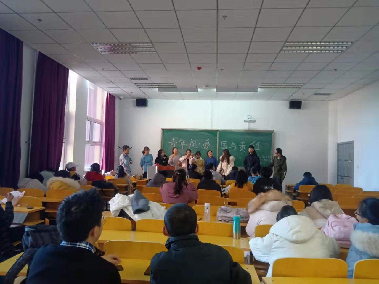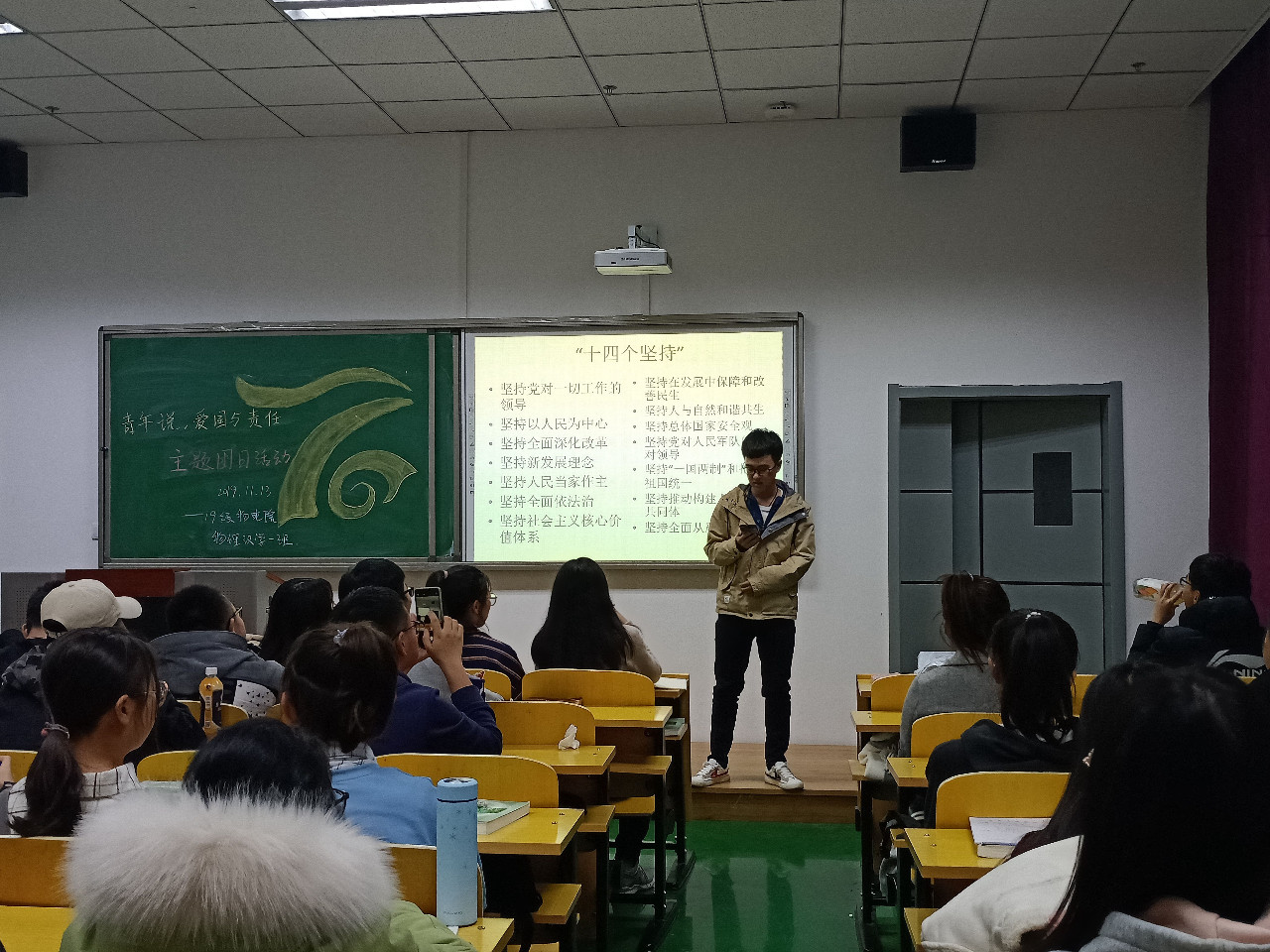 为提高学生思想认识,激发广大青年爱国志,进一步引导广大青年高举旗帜,坚定信念,增长才干,报效国家,我院各班级举行“青年说:爱国与责任”主题团日活动。
