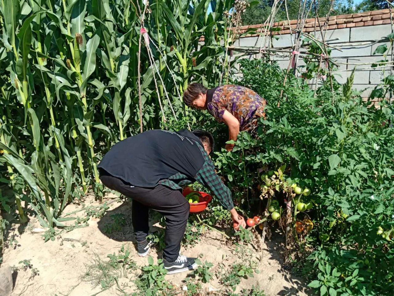 在国家脱贫攻坚政策的帮助下,村民贫困户的生活虽有所改善,但是贫困户中多是一些年迈的老人,身体不便,做农活费力。进入贫困户家中后,王华琛同学帮助老人打扫房间,清理院子里的杂草,给菜园浇水,除草,采摘蔬菜。因为村民之中有一些是空巢老人,王华琛也同他们一起走进田间地头,聊天帮忙。