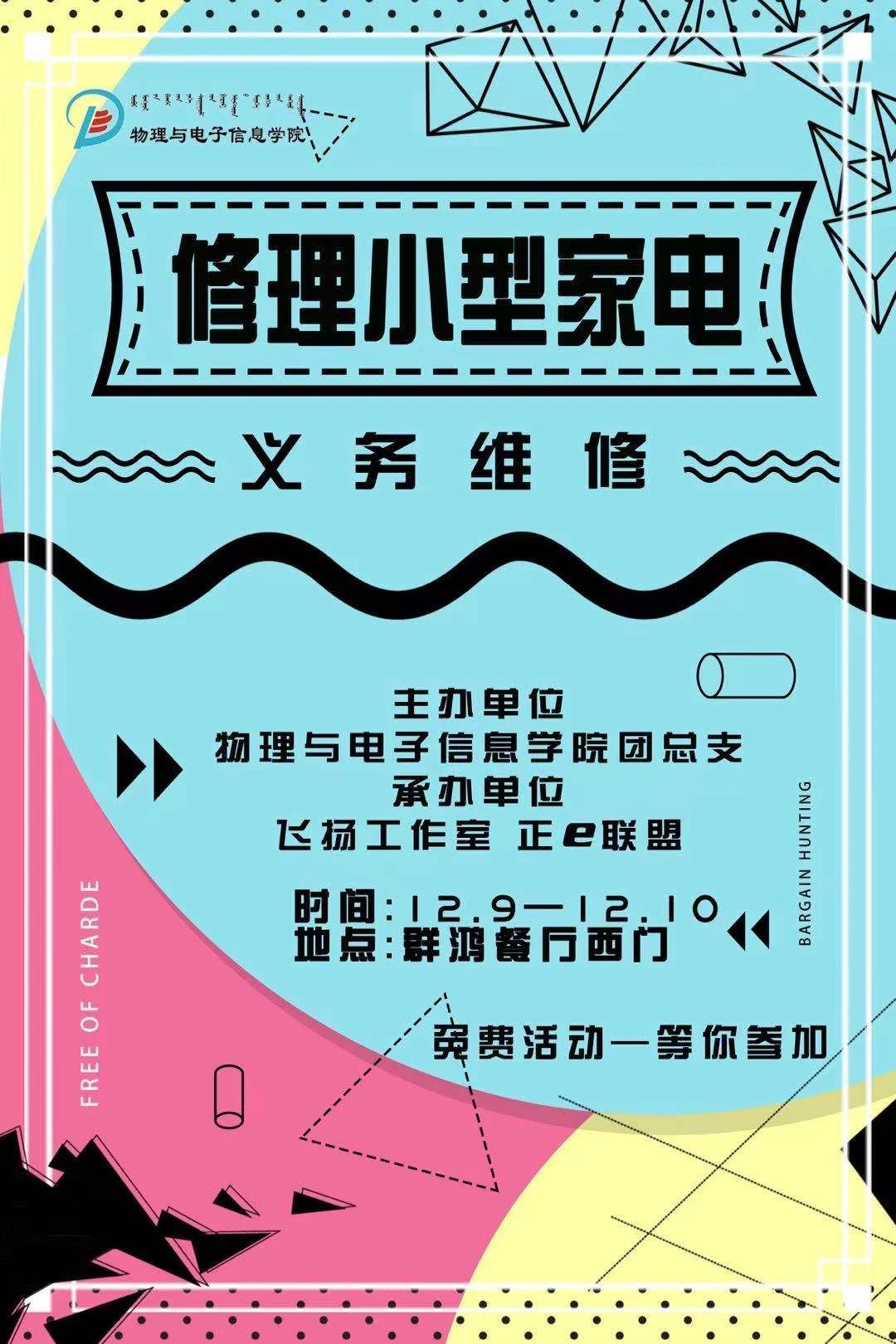 由yl23455永利集团团总支主办,飞扬工作室与学生社团正e联盟承办的小型家电义务维修活动将于十二月九号到十号中午在群鸿餐厅西门举办,有需要的同学可以来找我们帮忙哦!