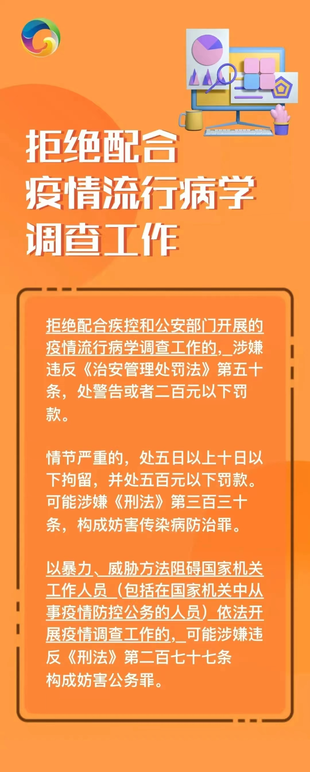 为帮助广大人民群众全面掌握疫情防控中可能出现的违法违规行为及可能产生的法律后果,推动疫情防控工作依法依规高效进行,特对疫情防控中常见的20种疫情防控违法违规行为及可能产生的法律后果进行提示: