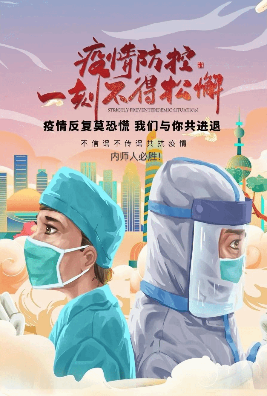 这个海报的颜色是五彩缤纷的,象征着疫情之下我们的活力与积极向上,呼市疫情爆发以来,我校听从上级安排,积极做好防护措施,海报上的两个主要人物便是这次抗疫的主角,他们穿着如同大白的衣服,但都是甘于奉献的老师、志愿者们,有了他们的保护才会有我们疫情下安宁的日子。海报上醒目的红字,更是体现了我校在抗击疫情中的坚定态度,最后作为背景铺垫的几处云朵,则象征着坚持抗击疫情,总有一天会突破这层云雾,迎来属于我们的胜利!