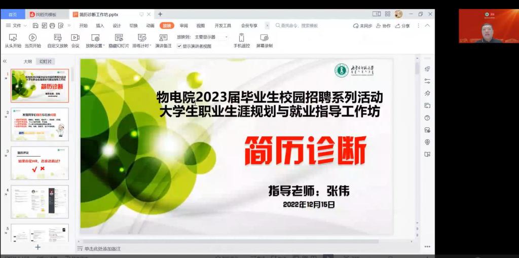 为全面提升毕业生求职能力,助力学生成功就业,我院大学生职业生涯规划与就业指导工作坊于2022年12月15日开展了简历诊断活动,经纬职业发展指导咨询室导师、学院党委副书记、副院长张伟老师为2020学硕班、2019材料物理班毕业班提供简历诊断服务。