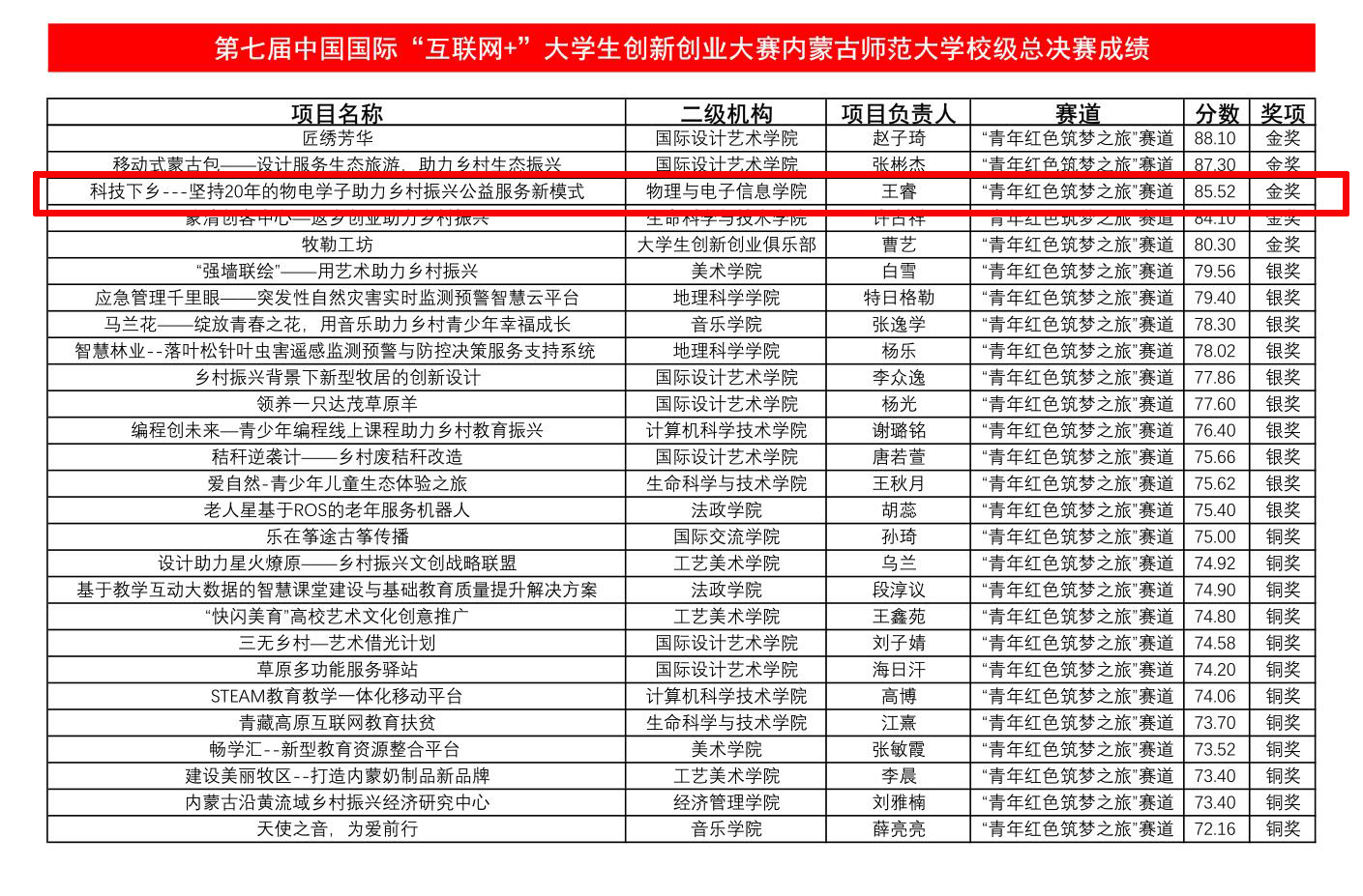 7月12日,由招生就业处主办、计算机科学技术学院承办的第七届中国国际“互联网+”大学生创新创业大赛yl23455永利校级总决赛在赛罕校区信息楼开赛。由我院党委副书记兼副院长张伟、辅导员宝力尔、宋鑫伟指导的《科技下乡一坚持20年的物电学子助力乡村振兴》项目荣获“青年红色筑梦之旅”赛道金奖,项目负责人为2019级材料物理班王睿。