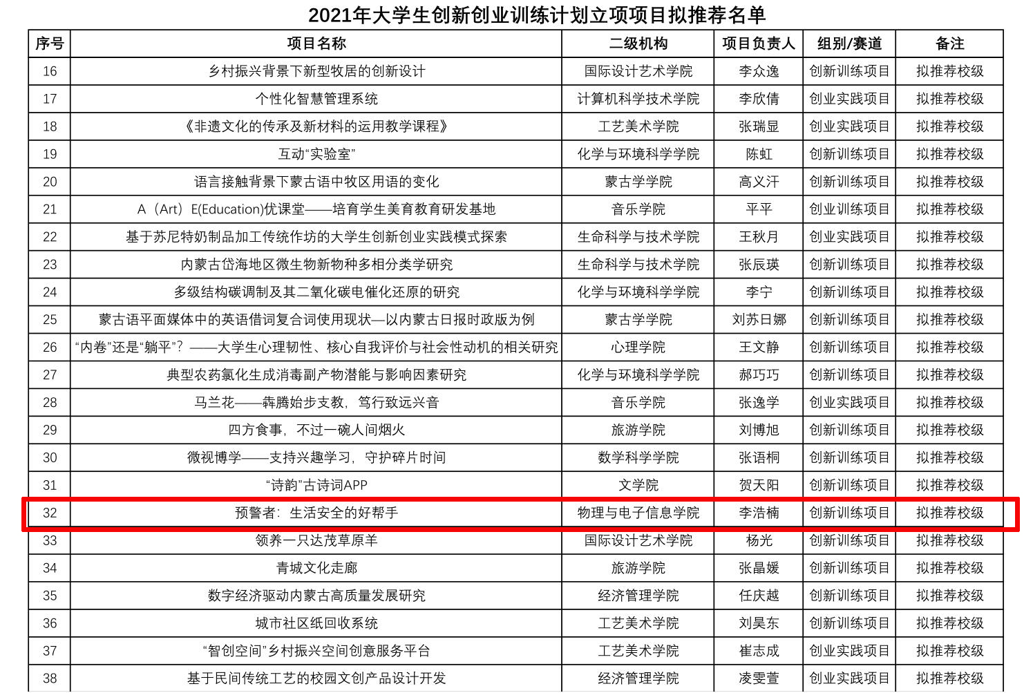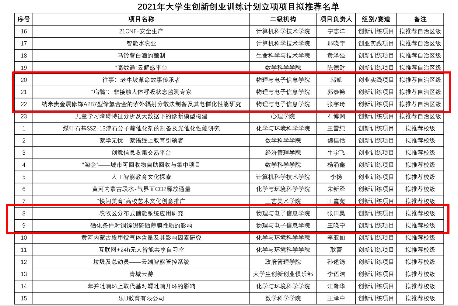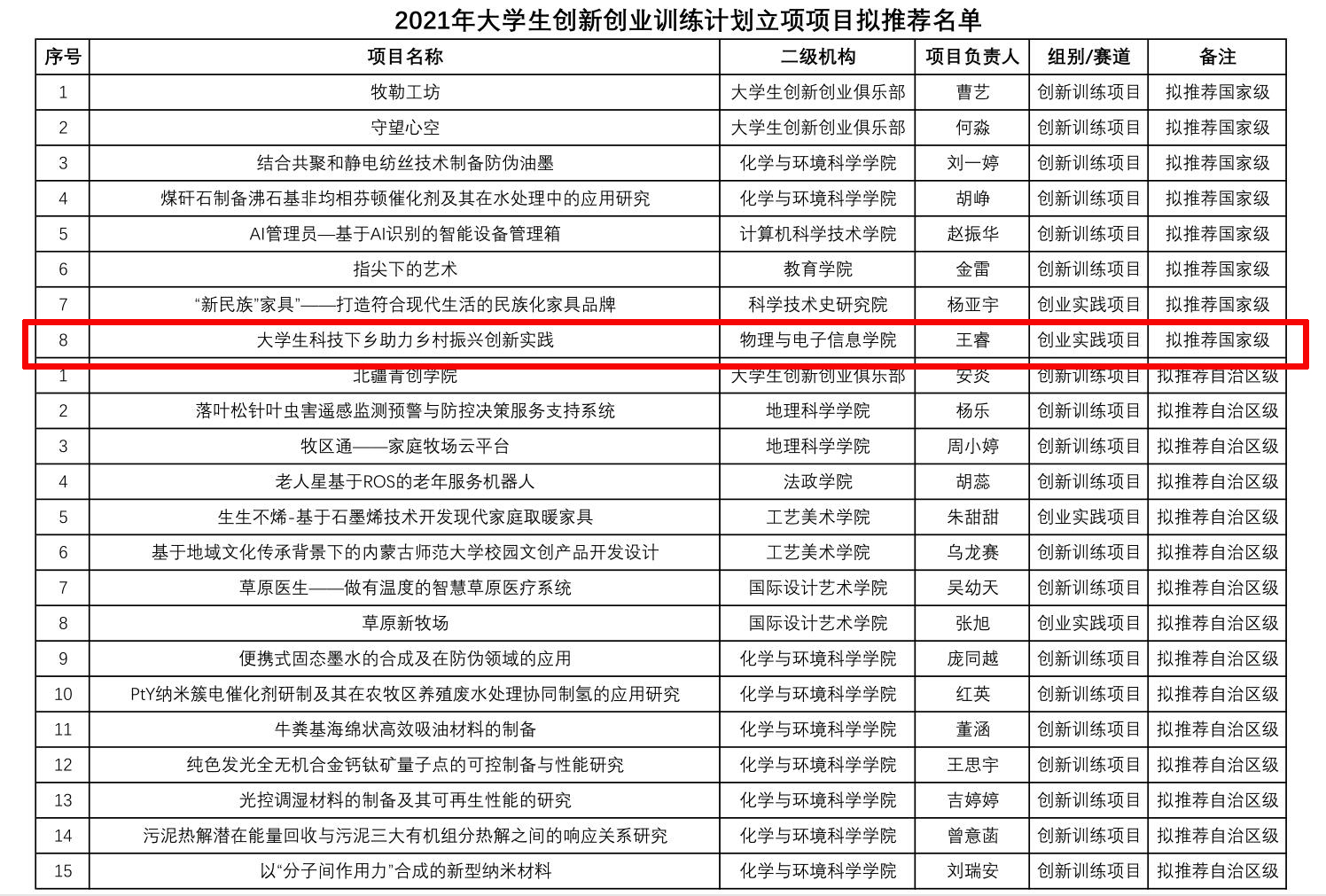 为深入贯彻全国教育大会精神,落实《国务院办公厅关于深化高等学校创新创业教育改革的实施意见》(国办发〔2015〕36号),按照《内蒙古自治区教育厅关于启动自治区级大学生创新创业训练计划项目的通知》(内教高函〔2016〕10号)要求和自治区级大学生创新创业训练计划工作安排,yl23455永利集团积极落实招就处安排,由学院学就办、实践创新部联合组织,遵循“兴趣驱动、自主实践、重在过程”原则,鼓励全院本科、研究生积极开展创新、创业训练与实践。在前期项目培育的基础上,学院对申报的项目进行筛选、推荐申报自治区级大学生创新创业训练计划项目和国创计划。经过学校评审,评选出31个国家级、自治区级大学生创新创业训练计划立项项目和40个校级大学生创新创业训练计划立项项目。其中,我院获国家级大创项目1项,自治区级大创项目3项,校级大创项目3项。