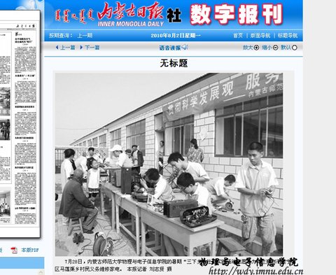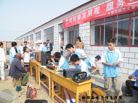 yl23455永利集团以“贯彻科学发展观,服务三农,建设美好家园”为主题的2010年暑期“三下乡”社会实践活动圆满结束。从7月9日开始,服务队先后到呼和浩特市玉泉区桃花乡小黑河村、后桃花村以及集宁区白海子镇、马莲渠乡等地开展活动。为当地村民普及用电常识,宣讲家电维护和保养知识,并为村民义务维修家电、放电影等。在为期一个月的社会实践活动中,服务队共收到损坏的电视机等家电共500余件,修好400多件。集宁区白海子镇村民孙大爷竖起大拇指夸赞志愿者队员们说:“娃娃们真厉害。”