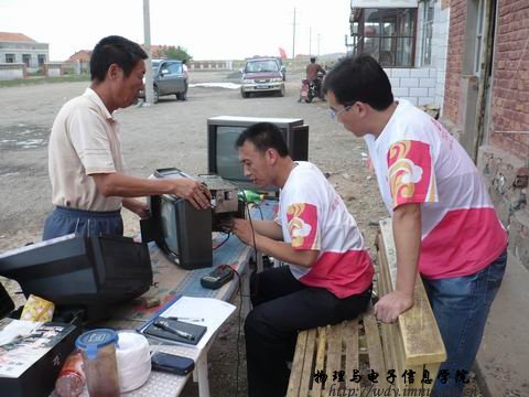 7月25日志愿者分为两个小组进行义务维修,一组去吉林郭勒镇边上的吉林牧场进行服务,另一组留在镇文化站继续为镇民维修。吉林牧场的牧民相当热情,在志愿者未到达之前就已经布置好维修地点。