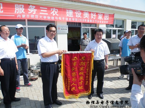 我院以“贯彻科学发展观,服务三农,建设美好家园”为主题的“三下乡”社会实践从7月11日开始,先后到集宁区白海子镇、马莲渠乡开展活动。为当地村民普及用电常识,宣讲家电维护和保养知识,并为村民义务维修家电、放电影等。 7月14号上午,志愿者们看望了白海子镇老党员乔吉贵和低保户杜枝梅两家,并带去牛奶和西瓜等物品。活动期间,服务队共收到损坏的电视机、电冰箱、洗衣机、电饭煲、鼓风机等家电共300余件,修好230多件。白海子镇村民孙大爷竖起大拇指夸赞志愿者队员们说:“娃娃们真厉害。”20日上午,白海子镇党委书记代表全体村民为服务队送来写着“暑期实践展才能、办事到家为人民”锦旗,马莲渠乡三成局村民高大爷也送来感谢信感谢志愿者们的周到服务。